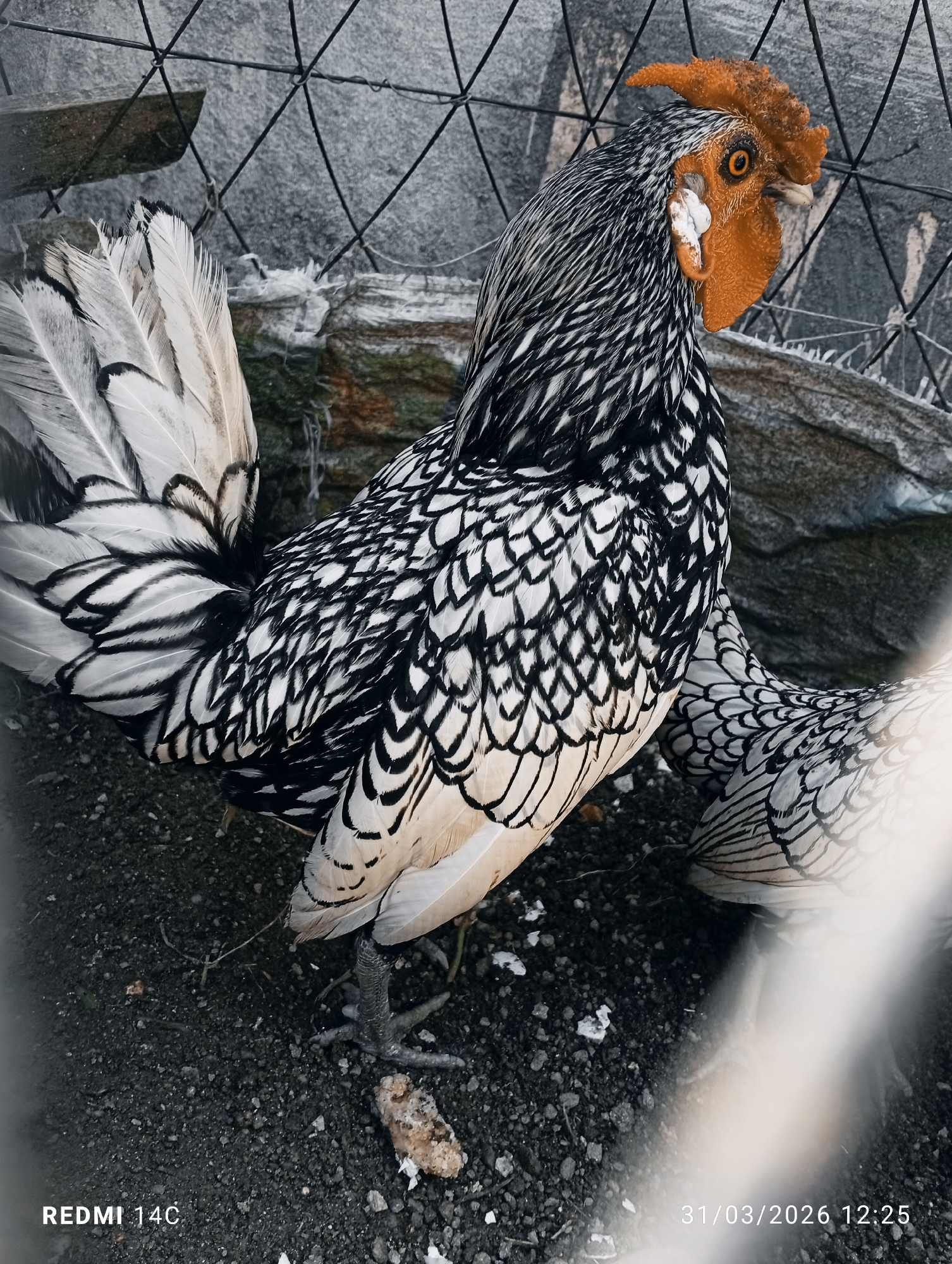 A photograph shows a silver Sebright chicken in an enclosure. The bird has black and white laced feathers, an orange comb, and is standing on dark ground. There is a wire fence in the background, along with some rocks. Another chicken is partially visible in the lower right of the frame. The location is unknown and is not verifiable as Lassan, Pakistan. The date and time "31/03/2026 12:25" and "Redmi 14C" are printed on the bottom of the image.