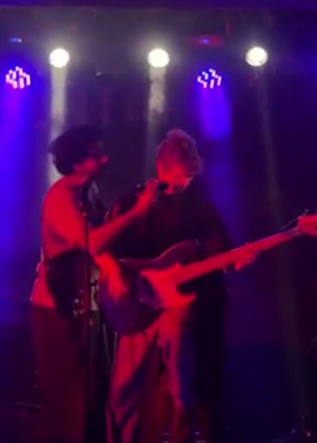 In a concert setting with blue and white stage lighting, a dark-haired individual standing behind a bassist appears to be cutting the bassist's hair with clippers while he plays
