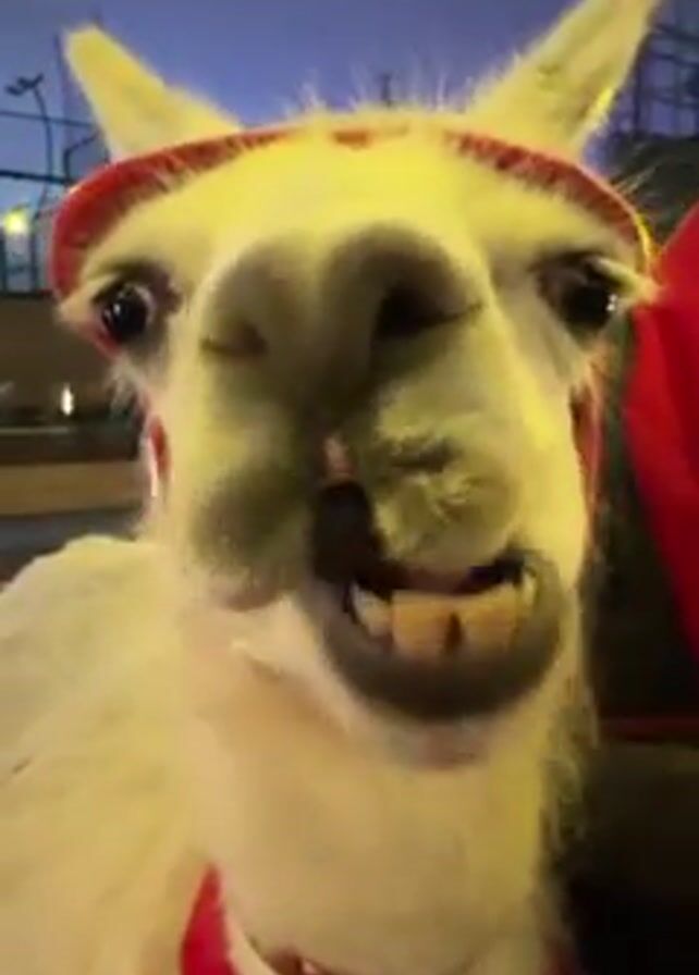 A close-up video shows a white llama. It’s wearing a red headband and collar. The llama opens its mouth wide, revealing its teeth. The background shows a blurred cityscape at dusk. A woman’s voice is heard speaking in the background.