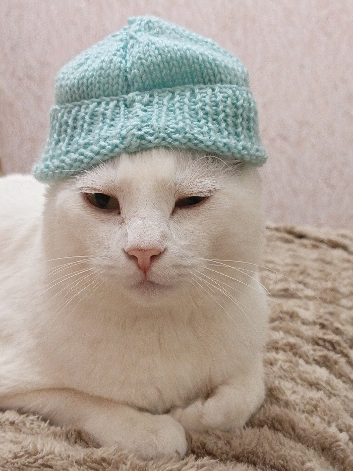 A white cat rests on a tan, textured surface. The feline has a slightly disgruntled expression with one eye partially closed. A light blue knitted hat sits atop its head. The cat's paws are neatly tucked beneath its chest. Long, white whiskers extend from its muzzle. The cat is the central focus of the image, dominating the frame.