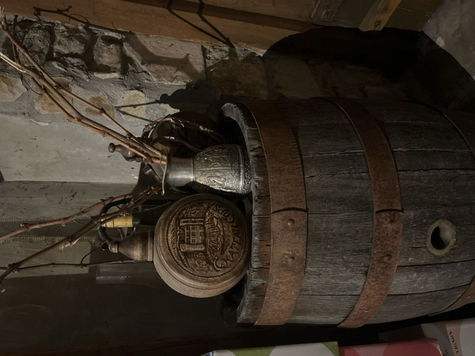 The scene is an indoor, dimly lit, static composition, situated in the city of Unknown, Unknown. No individuals are present. A dark, weathered wooden barrel, secured by three rusty metal straps, occupies the lower and central portion of the frame. Resting atop the barrel are two primary objects: to the left, a spherical wooden flask with a pointed wooden stopper, featuring a carved relief of a chateau above the text "CHATEAU COPS" set against a landscape; to the right, a silver-toned metal pitcher, intricately embossed with figures and patterns, from which a cluster of dry, leafless twigs extends upwards. The background on the right consists of a rough-hewn stone wall, with irregular stones and visible mortar, where multiple shadows from the twigs and other objects are cast. To the left, a stack of partially visible boxes, including one with a green and white pattern and another displaying "VIGNON" text, flanks the barrel. The overall lighting is low, creating a chiaroscuro effect.