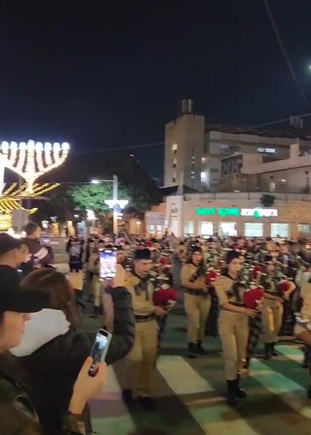 Scottish bagpipe band marching in a parade at night. The band members are wearing uniforms consisting of a khaki button-down shirt and trousers, black boots, and a black beret. A plaid scarf is draped over their shoulders. The band members are playing bagpipes while marching on a city street. Spectators are lining the street to watch the parade, and many are taking pictures or videos with their phones. In the background, there is a tall Christmas tree, as well as a large menorah and a crescent moon, all illuminated with lights. The video captures a festive and multicultural atmosphere.