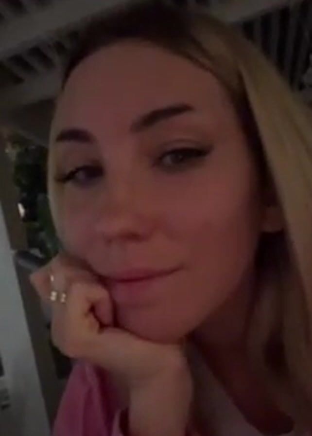 woman sitting outside at night. She is fair-skinned with blonde hair and is wearing a pink sweatshirt. She rests her chin on her hand, and a pen or other small cylindrical object is visible in her fingers. She is wearing a ring on her ring finger. In the background, there is a swimming pool with lounge chairs and a building. The video alternates between close-up shots of the woman's face and wider shots of the pool area. The environment appears to be a resort or hotel.