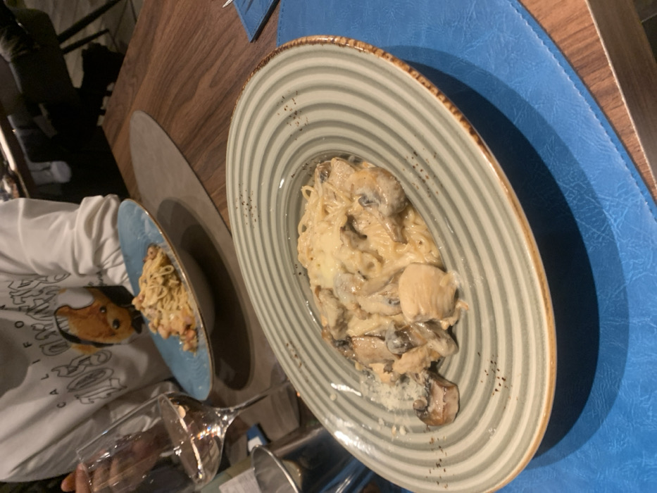 The image depicts an indoor dining scene within a restaurant or cafe in Vidin, Bulgaria. The primary subject is a shallow, round plate with a light grey, ribbed rim, positioned on a blue rectangular placemat in the foreground. This plate contains a serving of pasta (spaghetti) coated in a creamy white sauce, mixed with pieces of cooked chicken, sliced mushrooms, and topped with grated cheese and black seasoning specks. To the left of this plate, a clear stemmed wine glass, partially filled with a pale liquid, and a metallic jug are visible. A person is seated across the wooden table, partially visible from the chest up. This individual is wearing a white long-sleeved sweatshirt featuring black text ("CALIFORNIA" and "LOS ANGELES") and a brown cartoon character graphic. In front of this person, a blue plate holds a second pasta dish, appearing to be spaghetti with a reddish-orange sauce. The overall lighting is dim, suggesting an evening or interior ambiance, with dark, out-of-focus furniture in the background.