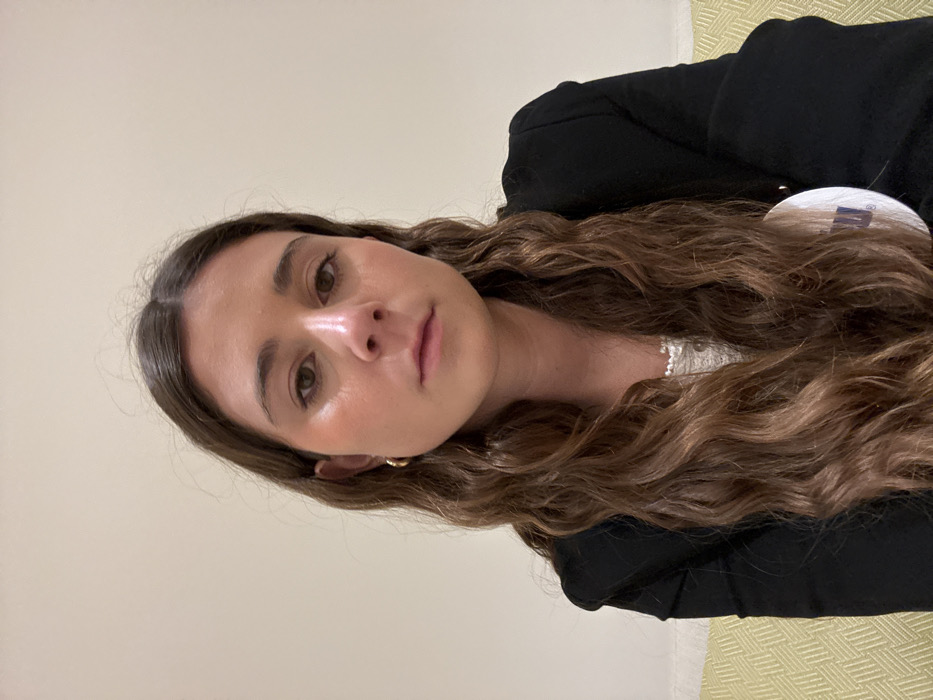 A young woman with long, wavy brown hair looks at the camera. She wears a black blazer over a white top adorned with pearls. Her skin is fair, and she has brown eyes. A small gold hoop earring is visible in her left ear. A white circular sticker with blue text is partially visible on her right shoulder. The background appears to be a plain white wall and a textured beige surface.