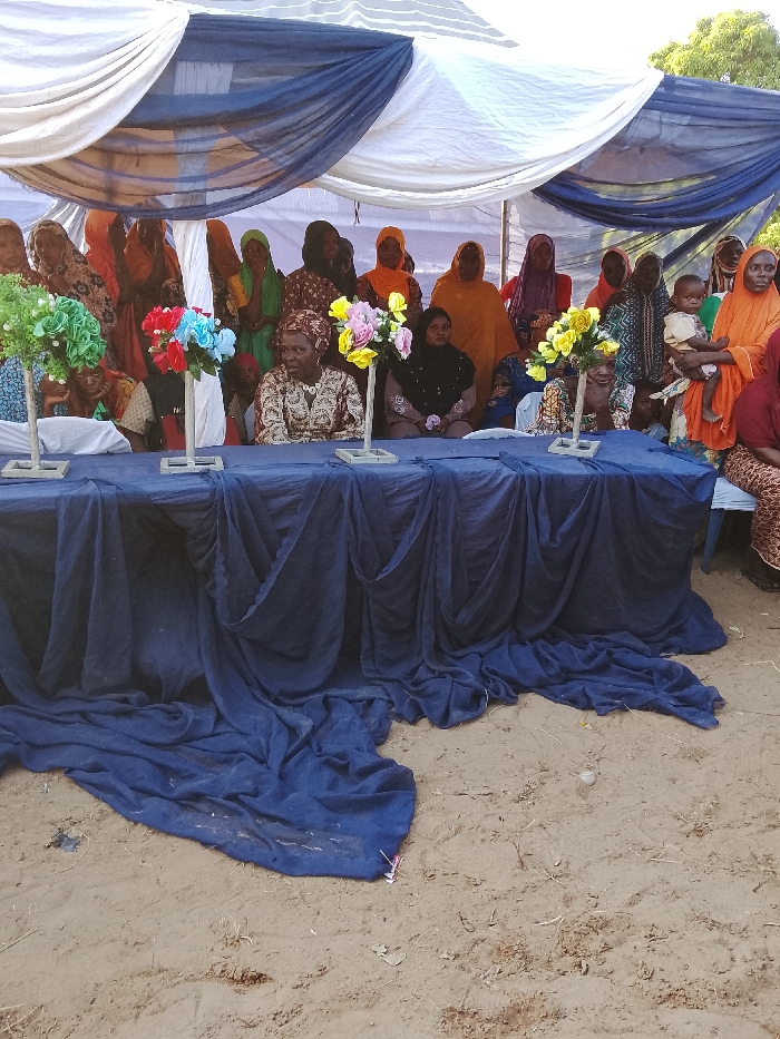 A group of women are gathered outdoors under a white and navy blue tent. They are seated behind a long table draped in blue fabric, adorned with faux flower arrangements. The women are wearing various colored headscarves and clothing. One woman holds a child. The ground is sandy. The setting suggests a formal event.