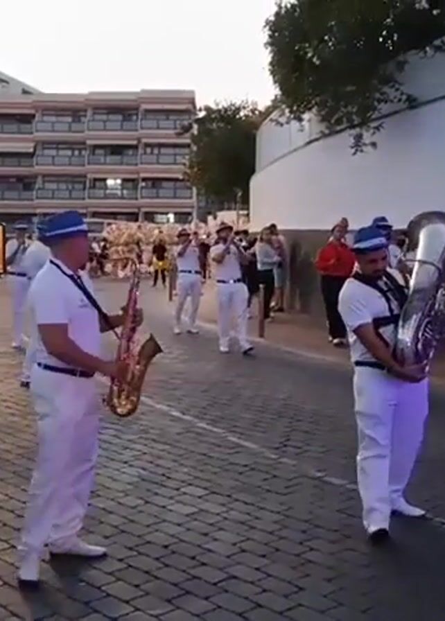 A marching band is performing on a brick-paved street. The band members, predominantly male, are dressed in white trousers, white shirts, and blue hats with white ribbons. They are playing various instruments, including saxophones, trumpets, and a tuba. Some band members have "BANDA DE ACAETE" and "Tropical" printed on their shirts. They are walking in formation, playing their instruments in sync. A few bystanders are observing the performance. In the background, there is a multi-story building with a hotel-like appearance and a white wall with a green tree behind it. The lighting suggests it might be evening, with a slightly dim sky. A white car is partially visible on the left side of the frame.
