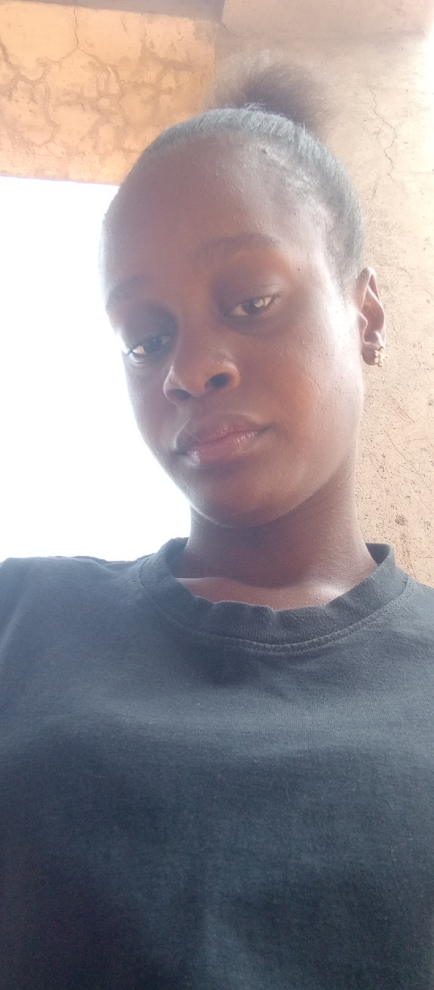 A close-up, low-angle shot depicts a young, dark-skinned woman with her hair pulled back in a bun. She is wearing a dark, crew-neck shirt. She has a small stud earring in her right ear. The background includes a white wall with sections of tan-colored wall showing at the top and right. No specific landmarks indicate the location as Akwanga, Nigeria.