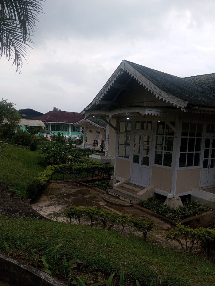 The scene is set in Nghĩa Đồng Commune, Vietnam, under an overcast sky. Dominating the right foreground is a single-story building of colonial architectural style, featuring light beige walls, white window frames, and white double doors. Its dark, gabled roof is adorned with weathered white scalloped bargeboards. The building is elevated on a foundation with concrete steps leading to its entrance. To the left, a landscaped area includes an upward-sloping grassy lawn, concrete pathways, and low, manicured hedges and small trees. In the midground, additional buildings are visible, notably one with a reddish-brown roof and a light green facade, positioned behind the foreground structure. Further back, another light-colored building can be seen. A palm frond partially obscures the top left corner of the frame. No individuals, actions, or interactions are depicted.