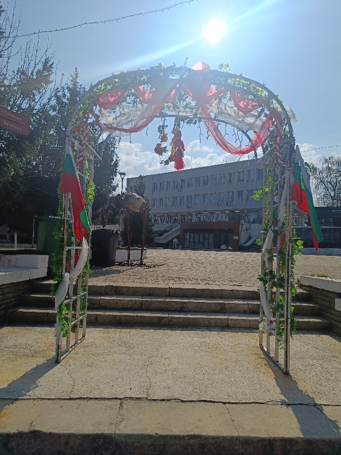 The image displays a decorated metal archway situated on a concrete landing in what appears to be a public square in Byala, Bulgaria