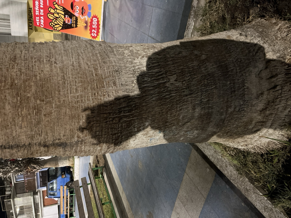 The image depicts an urban nighttime scene, likely in a public park or plaza within Arica, Chile, based on the commercial signage. In the immediate foreground, a large, rough-textured palm tree trunk dominates the center frame. A distinct, full-body human shadow, approximately 1.8 meters tall, is cast onto the trunk, suggesting a light source is behind the person off-camera to the left. The base of the tree is surrounded by a narrow patch of sparse grass, bordered by a concrete curb. To the left of the tree, a paved walkway of dark gray square tiles and lighter gray rectangular strips extends into the midground. A wooden park bench with green metal supports is situated parallel to the walkway. Further left, a blue pickup truck with an exposed flatbed is parked on an unpaved surface, facing left. Several other palm trees are visible in the midground. To the right of the tree, in the midground, a brightly lit, yellow and red A-frame sign advertises food. The sign displays "AKAPACHA" and "EL SEÑOR CARA DE PAPA" (Mr. Potato Head), featuring cartoon images of french fries and characters, with a price of "$2.500." In the background, multi-story urban buildings with visible windows and balconies are discernible, some with active interior lights. The scene is illuminated by artificial light sources, indicating night or late evening.
