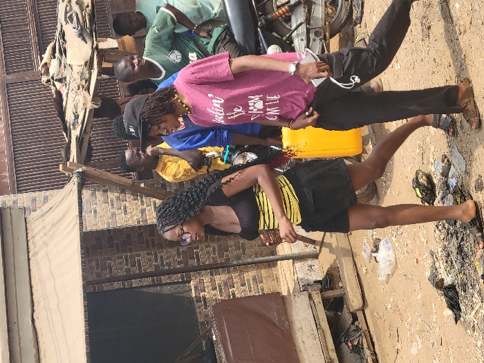 This image depicts a street scene in Awka, Nigeria, under daylight conditions. The foreground features an unpaved, dusty ground heavily littered with various debris, including plastic bags, charred material, and discarded items. Two females walk from right to left in the foreground. The female on the left wears a black top with horizontal yellow stripes, black shorts, and black slide sandals. She has long dark braids, wears glasses, and holds an unidentified thin brown object in her right hand. The female on the right wears a black baseball cap, a maroon t-shirt with white text, and dark cargo pants with brown slide sandals. She has dreadlocks visible beneath her cap and holds a white smartphone with white earbuds in her left hand. A silver watch is on her left wrist, and she wears a light-colored beaded necklace. In the midground and background, a group of approximately five males is visible. One male in a yellow t-shirt is partially obscured by the foreground individuals. Another male in a blue long-sleeved shirt is also partially obscured. A male wearing a green t-shirt with white lettering is seated on a dark-colored motorcycle, facing right. Another male in a light green t-shirt stands behind him. A yellow jerry can is positioned between the foreground and midground figures. The background consists of a brick building on the left, topped with a light-colored fabric awning. Further right, a brown corrugated metal gate or wall is visible, with a makeshift wooden structure supporting what appears to be a canopy or stall made of various materials. The overall environment suggests a bustling, possibly commercial or residential street.