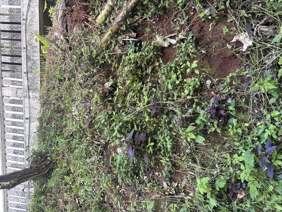 The image displays a steep, vegetated earthen slope in the city of Unknown, Thailand. The slope is primarily covered with various green plants, grasses, and weeds, interspersed with multiple patches of reddish-brown soil. Several plants exhibit dark green or purplish foliage. On the upper left, a partially exposed, thick tree trunk or root system is visible. Towards the mid-right, two segments of bamboo stalks lie horizontally on the slope. Scattered dried leaves and other organic debris are present throughout the vegetation. In the upper background, above the slope, a concrete structure featuring a decorative balustrade with ornate, patterned panels is visible. Below the balustrade, a grey concrete wall extends, with a thin green wire or vine strung horizontally across its surface. No human subjects are present in the scene.