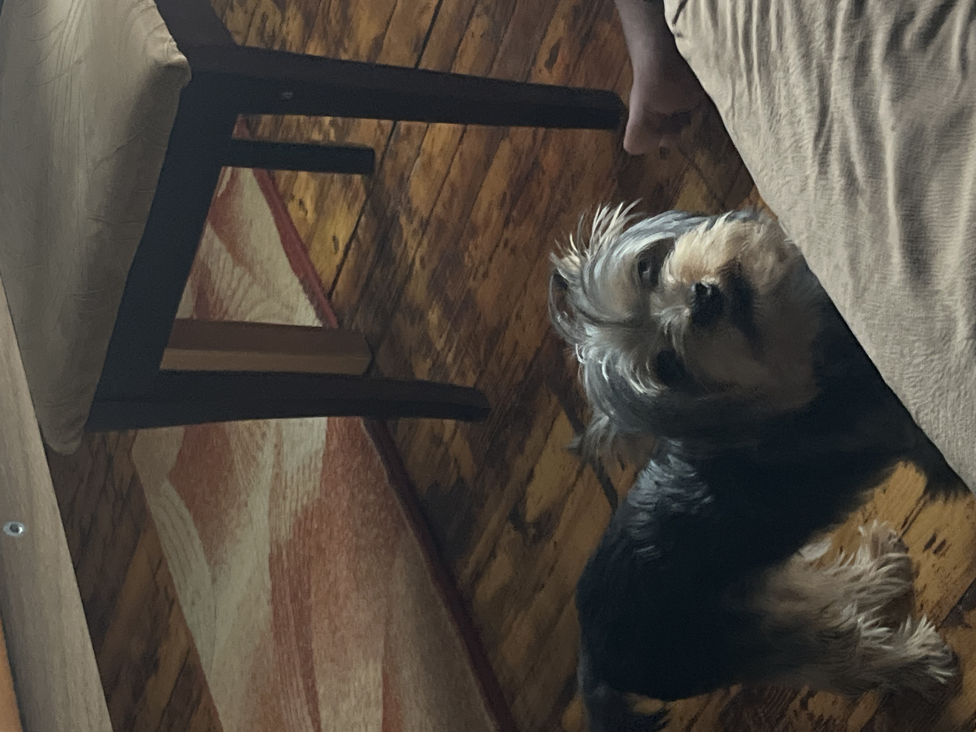 A Yorkshire terrier dog lies on a wooden floor partially covered by a beige blanket and near a dark brown chair