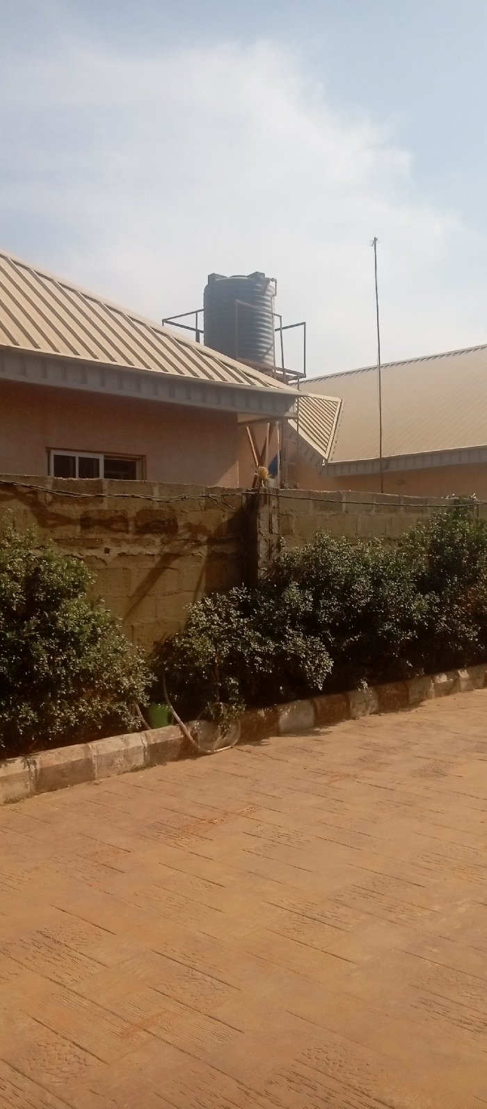 A single-story building with a tan roof and walls is visible behind a concrete block wall lined with bushes. A black water tank rests on a metal frame atop the building's roof. A lightning rod extends upward from the building's roofline. The foreground shows a brick-paved area in shades of brown. The sky appears bright and slightly overcast.