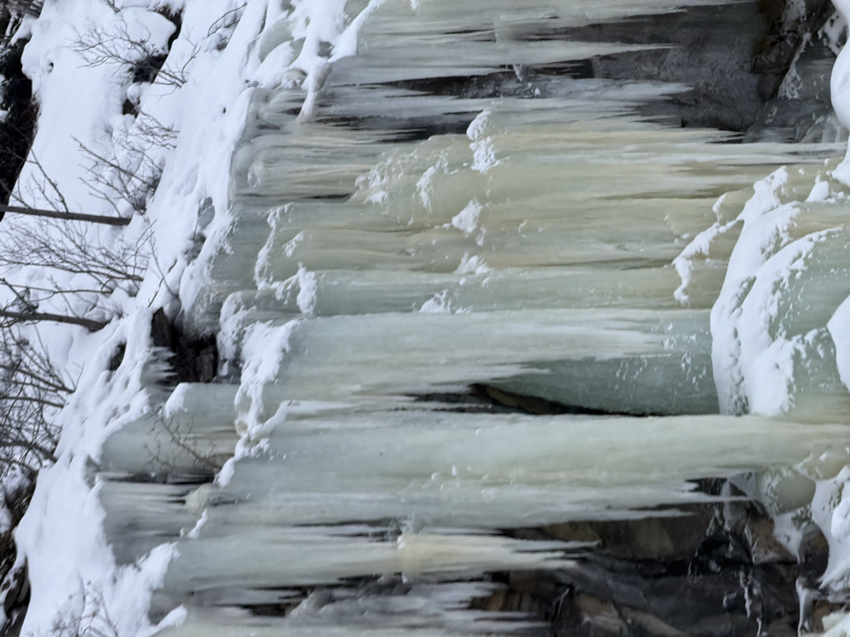 A detailed view of a large, vertically oriented, frozen rock face is presented within the city of Harstad, Norway. The scene is dominated by extensive ice formations, including numerous large, elongated icicles and cascading frozen water. These ice structures exhibit varied coloration, ranging from translucent light blue-green to opaque pale yellow and white. They descend from a dark, rocky substrate, with sections of the dark grey-black rock visible between the ice formations. The upper section of the rock face and the ground above the ice are covered in a thick layer of white snow. Sparse, bare deciduous tree branches and twigs protrude from the snow-covered areas along the upper ridge. No individuals, animals, or specific actions or interactions are depicted in the frame.