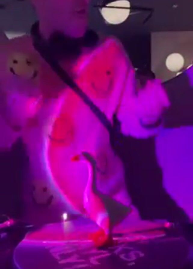 A DJ in a pink sweater covered in smiley faces is mixing music at an event. The DJ is wearing pink glasses and has headphones around their neck. They’re manipulating the turntables and equipment, and a small goose statue is lit up in front of them. The lighting in the room is primarily purple.
