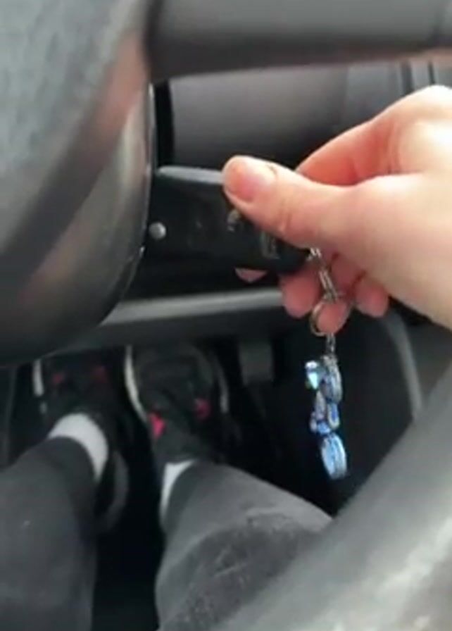 A person is sitting in the driver's seat of a car. They insert the key into the ignition and turn it to start the engine. The key has a bicycle keychain. The person is wearing black jeans and black and red sneakers with white socks. The interior of the car is visible, including the steering wheel and dashboard.