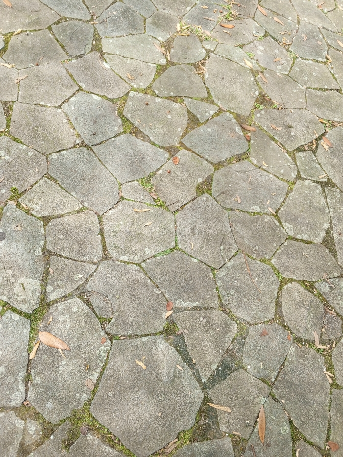 section of outdoor paving. The paving stones are irregular, polygonal shapes, likely made of concrete or a similar material. The stones are mostly gray, with some variation in tone. Moss or grass grows between the stones, adding green to the scene. Scattered dried leaves are present on the surface, lending a natural, slightly weathered appearance.