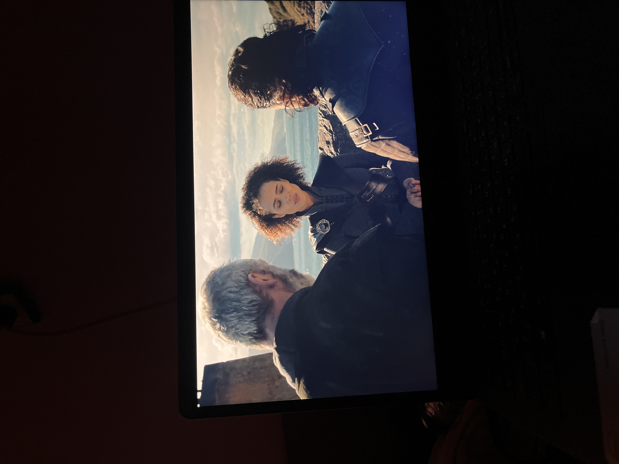 A laptop screen dominates the frame, displaying a cinematic scene set outdoors on a rugged coastal clifftop under a partly cloudy sky, overlooking a body of water with distant landmasses. Three individuals are depicted: a man with grey hair and beard, seen from behind on the left; a woman with dark, curly hair, positioned centrally and facing slightly right with her eyes closed or down, wearing dark, ornate clothing with a prominent circular brooch; and a man with dark, wavy hair, seen from behind on the right, wearing dark, armored-like attire with visible straps and buckles. The ambient environment is dimly lit, suggesting an indoor setting. The laptop's keyboard, displaying illuminated keys with a non-standard layout, is partially visible at the bottom. A small black accessory is clipped to the top edge of the laptop screen, with a dark cable extending downwards. The actual location is an undetermined indoor location.