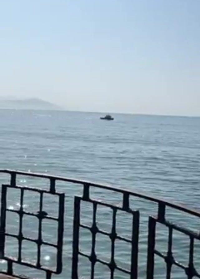 calm sea with a distant boat, viewed through the railing of a pier or boat. The camera pans to the right to show a stone structure on a point of land. The sky is clear and blue.
