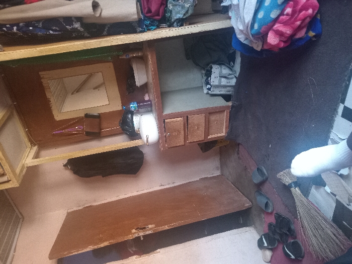 This image depicts a cluttered interior room, likely in the city of Jos, Nigeria, viewed from a low angle. In the immediate foreground, a foot wearing a white sock is visible on a dark rug. To the left, a traditional straw broom lies on the floor next to several pairs of sandals and slippers (black, grey, tan). A partially open brown wooden door is visible to the mid-left, revealing a darker space beyond. The walls are a light, faded pink or peach color, showing some wear. In the mid-ground right, a wooden dressing table or desk is present, featuring three small drawers on the left side and an open alcove on the right, under which a patterned storage bin is visible. On the tabletop, from left to right, are a white lidded pot, a black plastic bag, a blue plastic bottle, another white bowl, and a smaller bottle. A brown purse with a purple strap hangs from a wooden frame directly above the table. A rectangular mirror is mounted on the wall above the tabletop, reflecting a portion of the room's ceiling (wooden planks or similar material) and an angled wall. The dressing table is integrated into a makeshift wooden structure, possibly a wardrobe or shelving unit. To the far right, various clothes are visible, some hanging, others stacked in a pile of folded blankets or garments, including items with a blue polka dot pattern, pink, and grey fabrics. A dark garment is also hanging on the wall to the left of the dressing table. The floor comprises a mix of dark rug, bare concrete, and black and white patterned tiles near the foreground. The lighting suggests ambient illumination from an unseen source, possibly augmented by a bright light on the foreground foot.