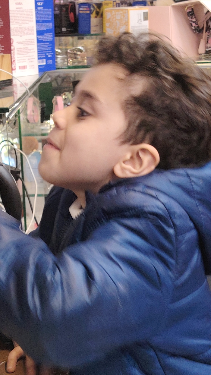 An indoor scene in Barza Municipality, Syria, depicts a young child, possibly male, in a left profile view, occupying the foreground. The child has fair skin, dark brown wavy hair, and is wearing a dark blue puffer jacket with a white collar visible underneath. The child gazes slightly upwards and to the left with a subtle smile. The background is blurred, showing multiple glass display shelves stocked with various retail products, including boxed items, some labeled "SORA" and "SKY," and other unidentified merchandise. White wires are visible in the lower left portion of the background. The environment suggests a commercial establishment.