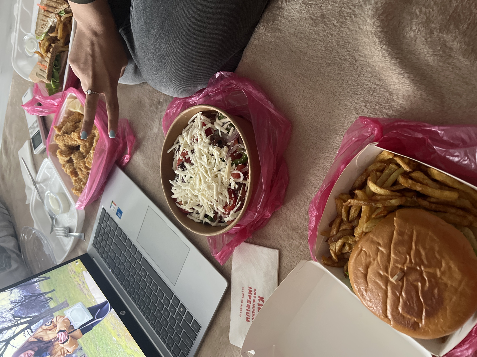The scene depicts an indoor environment, likely a bed or sofa, covered by a light brown, textured blanket. Multiple takeout food items are arranged around an open silver HP laptop. The laptop screen displays a video of a young female with dark hair, wearing a yellow puffer jacket and holding a white bag, standing in an outdoor park. To the lower left, a white cardboard box containing a burger and french fries rests within a translucent hot pink plastic bag. In the center, a round cardboard bowl filled with a salad (including tomatoes, onions, olives, and shredded white cheese) is also encased in a hot pink plastic bag. To the right of the laptop, a white polystyrene container holds fried chicken pieces and a lemon wedge, similarly packaged in a hot pink plastic bag. Another white polystyrene container, partially visible at the top right, contains a sandwich, french fries, and a small cup of white sauce. A white paper napkin, inverted, displays the text "KIDS IMPERIUM" and a phone number, "+359 89 9159373," which confirms the location as Bulgaria. A clear glass bowl, a silver fork, and a white flip-phone are also present on the blanket. A person's right hand, with light blue nail polish on the fingernails and a silver ring on the ring finger, is visible on the right, making a two-finger peace sign. The person is wearing dark gray legwear. The scene suggests a casual meal or snack activity in Kribul, Bulgaria.
