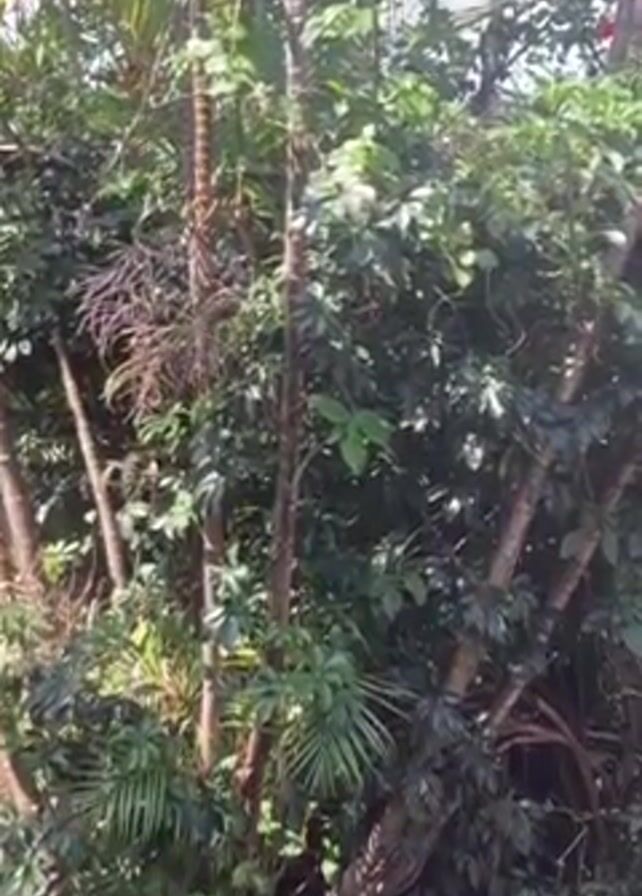 The camera is pointed at a dense cluster of trees and bushes in daylight. The vegetation includes slender palm trees and various plants with green leaves. The backdrop is a partially visible sky, and the overall impression is of a lush, overgrown garden or natural area. There are no people present in the frame.