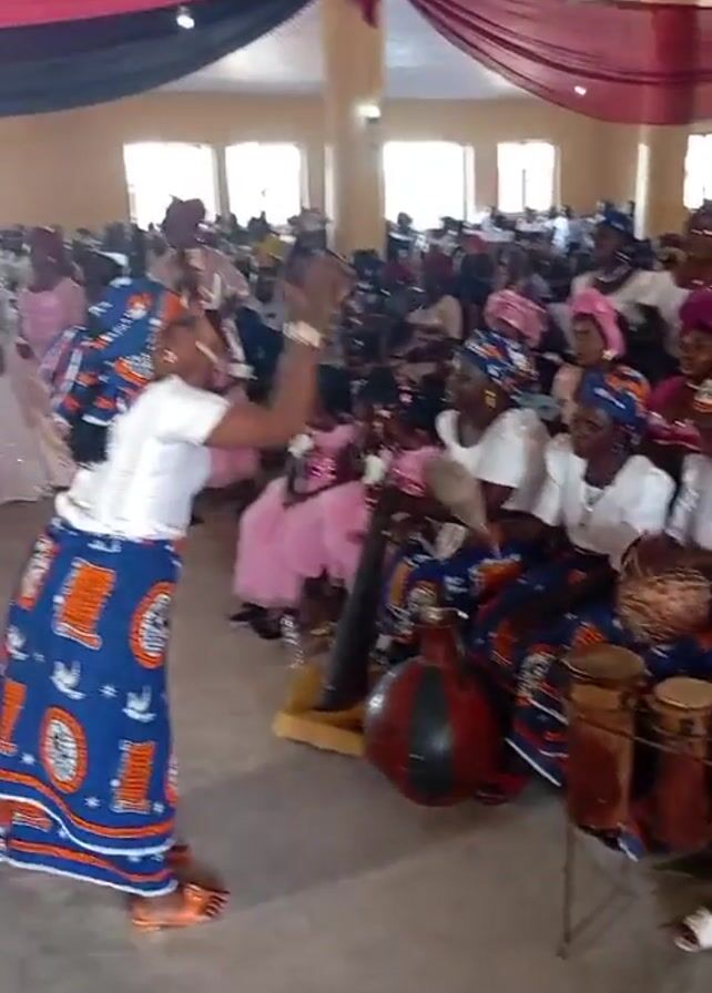 crowded indoor event, likely a wedding celebration. The space has pink and black draping from the ceiling, large windows on the back wall, and numerous seated people. Most of the seated individuals are wearing similar head wraps, and some are playing traditional drums. A woman stands in the foreground, facing the crowd, with her arms raised and wearing a matching outfit to the seated drummers. In the background, a bride and groom stand amidst the crowd, dressed in wedding attire.