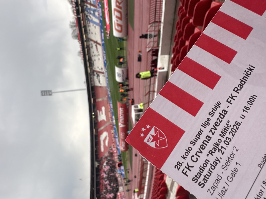 The image displays a close-up of a red and white striped football match ticket held in the foreground, with the background revealing a stadium scene. The ticket identifies the event as the 28th round of the Serbian SuperLiga match between FK Crvena Zvezda and FK Radnički, scheduled for Saturday, March 21, 2026, at 4:00 PM. The venue is specified as Stadion "Rajko Mitić" in Belgrade, Serbia, with the ticket granting access to "Zapad - Sektor 2, Ulaz / Gate 1." The FK Crvena Zvezda logo, featuring a red star and three smaller stars, is prominently displayed on the ticket. The background shows the interior of the stadium under an overcast sky. Red plastic stadium seats are visible in the immediate foreground and extend into the stands. The stands are predominantly red and white, with large white letters (partially visible as "JE") against red backdrops on the far side. A red running track encircles a green grass football pitch. Inflatable advertising hoardings, bearing brands such as "macron," "MOZZART," and "G-DRIVE," line the perimeter of the pitch. A moderate crowd is present in the stands, particularly concentrated in the section to the left, with some individuals holding flags or banners. Several personnel, some wearing high-visibility yellow or green vests, are positioned on the running track and near the pitch. One individual in a yellow-green vest is depicted climbing over a barrier. A white utility vehicle is also visible on the track. A tall floodlight tower extends into the sky above the stadium structure. The perspective is from a spectator's viewpoint, with the ticket in sharp focus and the stadium scene in soft focus.