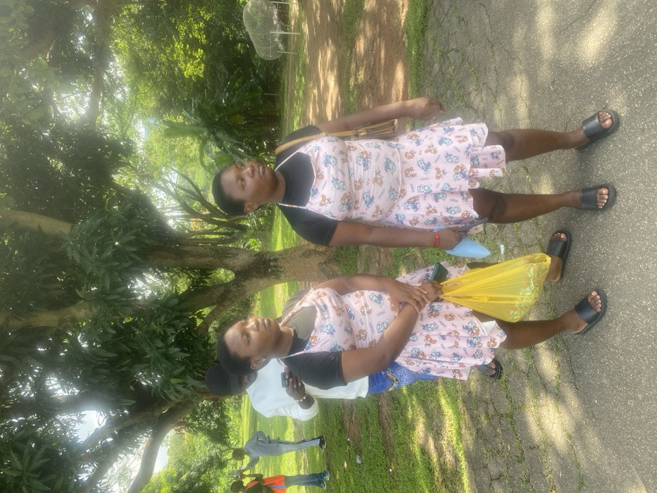 This outdoor image, captured under natural daylight, depicts a scene at what appears to be the Abuja National Children's Park and Zoo in Abuja, Nigeria, based on the presence of green spaces, mature trees, and an animal enclosure-like structure. In the foreground, two women, visually identical, stand side-by-side on a light grey paved path, facing slightly right of the camera and looking into the distance. Both are dressed in black t-shirts layered under pink halter-neck dresses patterned with various small, light-colored cartoon-like animal figures, and both wear black slide sandals. The woman on the left holds a yellow plastic bag containing green produce and a dark object in her clasped hands. The woman on the right carries a light brown shoulder bag over her left shoulder and holds a light blue object in her left hand, with a red wristband visible on her right wrist. Behind the woman on the left, a man is partially visible, wearing a white long-sleeved top and a black baseball cap, looking down at a smartphone held in both hands. In the far left background, two other individuals are present; one wears an orange vest over a dark top and blue jeans, holding a device suggestive of a camera or phone, while the other stands nearby in a light shirt and blue jeans. To the far right in the background, a large, dome-shaped mesh structure, characteristic of an animal enclosure, is visible among the trees. The environment is lush with dense green foliage, mature trees including a prominent large tree in the midground, and grassy areas surrounding the paved path.