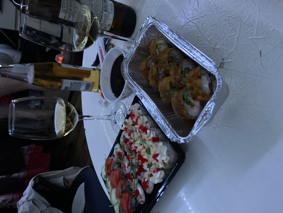 The scene depicts an indoor setting, likely a private residence in Saratov, Russia, centered around a white, textured table surface. On the table, various food items and drinks are arranged. A black plastic takeout tray on the left contains approximately 20 pieces of sushi or rolls, featuring two distinct types: one with reddish-pink fish slices and green garnishes, and another with white creamy topping, red roe, and small green sprouts. Adjacent to this, in the lower right, an aluminum foil takeout container holds eight pieces of deep-fried or breaded sushi rolls, exhibiting a golden-brown crust and visible green and white fillings. Two clear stemmed wine glasses, each partially filled with a pale yellow liquid (white wine), are positioned towards the upper part of the table. Between them, an upright brown glass beer bottle, labeled "Krone," also containing a pale yellow liquid, is visible. A second, partially obscured brown beer bottle is on the far right. A small white ceramic bowl containing dark brown soy sauce is located centrally. A pair of white disposable chopsticks, still in their paper wrapper with Cyrillic text, rests beside the soy sauce bowl. The background is dark and out of focus, suggesting a low-light environment. No individuals are visible in the image.