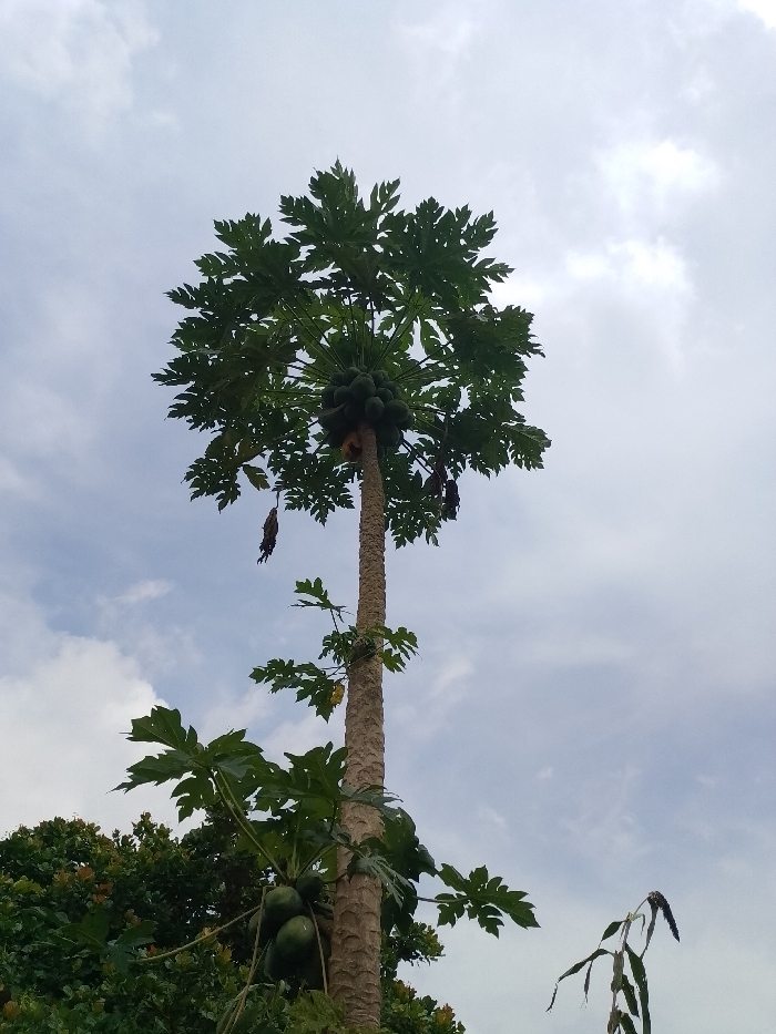 - "This image, taken in Ugwolawo, Nigeria, depicts a tall papaya tree (Carica papaya) observed from a low-angle perspective against a partially cloudy sky" by FM-TKrYD3, licensed under CC BY 4.0