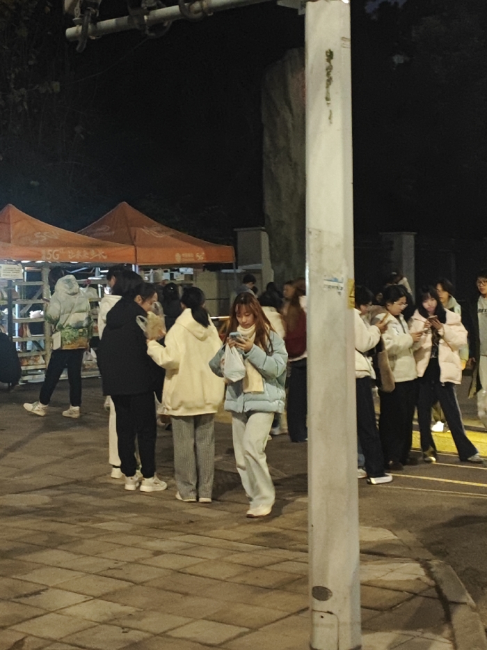 The image depicts a nighttime street scene in Shapingba District, China. A group of approximately 15-20 young adults are gathered on a paved area, illuminated by artificial light sources. In the left half of the frame, two orange pop-up tents, possibly market stalls, are visible. The tent on the left has "5G" and Chinese characters printed on its side. Several individuals are positioned near these tents, some appearing to browse. A prominent white, octagonal street pole stands vertically in the right foreground, partially obscuring the background. The central figure is a young woman with long, light brown hair, dressed in a light blue puffer jacket, a cream scarf, and light-colored pants. She is holding a white plastic bag in her left hand and looking down at a smartphone held in both hands. To her immediate left, another individual in a cream-colored hoodie and striped pants is positioned. Further left, an individual in a black jacket stands with their back largely to the viewer, near the tents. To the right of the street pole, a cluster of individuals is observed, many also looking down at their smartphones. The ground is paved with rectangular tiles. The background is dark, suggesting the scene is outdoors at night.