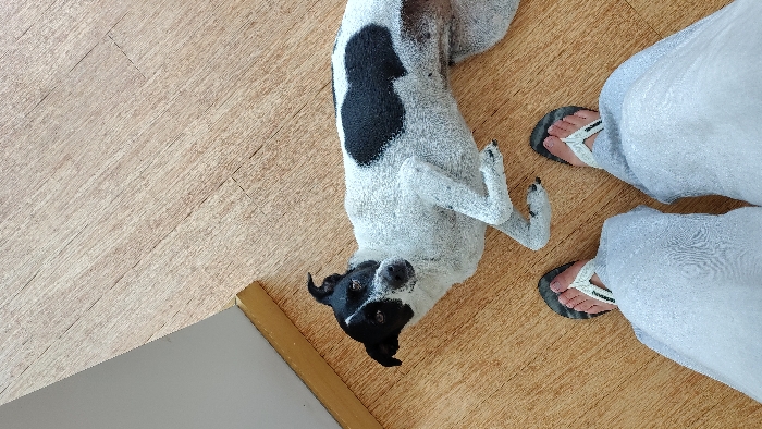 An indoor scene, presumably in Chorrillos, Peru, depicts a black-and-white patterned dog lying on a light-colored, wood-patterned floor. The dog's body is primarily white with a large irregular black patch on its back and black markings on its head and ears. Its head is turned, and its eyes are directed upwards towards the camera. In the foreground, the lower legs and feet of a person are visible, clad in light-colored, loose-fitting pants and black flip-flops with white straps. A light-grey wall with a light-brown baseboard is partially visible in the upper-left quadrant of the frame.