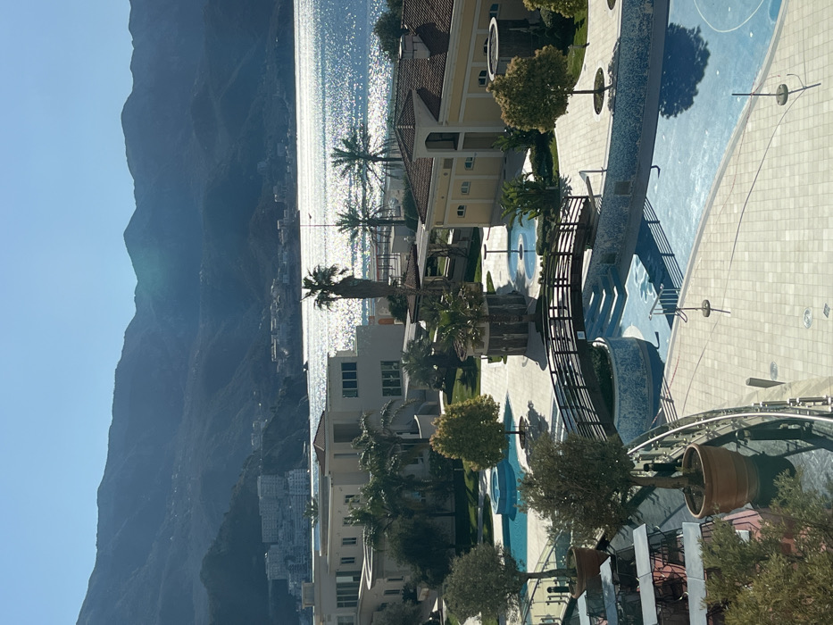 The image depicts a sunlit resort complex in Boreti, Montenegro, overlooking a body of water with mountains in the background. In the immediate foreground, a curved glass balcony railing separates the viewer from the scene. To the left, several outdoor tables with chairs are partially visible, suggesting a dining area. Two large potted trees are positioned adjacent to the glass barrier. Immediately below the railing, a light blue-tiled swimming pool or water channel with integrated steps is visible. A dark, arched wooden bridge with railings spans across this water feature. A single individual in dark clothing is partially visible standing next to the leftmost potted tree, near the glass barrier. The midground features an expansive, light-colored paved area, likely consisting of stone pavers, intermingled with landscaped sections of grass and trees, including palm trees and deciduous varieties. Multiple swimming pools and water features of varying shapes are present, one featuring a small fountain. Several low-rise buildings with light-colored facades and reddish-brown tiled roofs are scattered throughout this area. These structures exhibit architectural details such as multiple windows and arched doorways. Two cylindrical, wood-paneled structures, possibly gazebos or decorative features, are visible near the pools. The background comprises a large body of water, likely the Adriatic Sea or a bay, which reflects the bright sunlight, creating a sparkling effect across its surface. A narrow strip of beach with a few palm trees is discernible along the shoreline. Beyond the water, a prominent range of dark, verdant mountains rises steeply under a clear, light blue sky. Along the far coastline, several clusters of modern, multi-story buildings are visible, indicating urban or resort development. The scene is illuminated by clear daylight, casting distinct shadows.