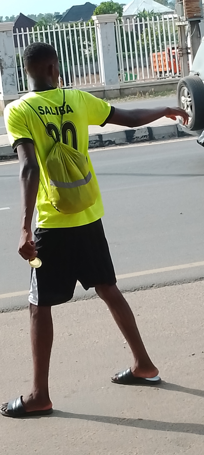 The scene depicts an individual standing on a light grey concrete sidewalk in Lokoja, Nigeria, adjacent to an asphalt road. The subject, a dark-skinned person viewed from behind, wears a neon yellow short-sleeved t-shirt with "SALIBA" and the number "20" printed in black on the back, black athletic shorts with white vertical stripes on the sides, and black slide sandals. A lime green drawstring bag, featuring a grey reflective strip, is worn on their back, slung over the right shoulder. In the left hand, the individual holds a circular, metallic gold-colored object. The right arm is extended horizontally towards the right side of the frame, where a portion of a white vehicle, specifically a wheel and adjacent body panel, is visible on the road. A black and white striped curb separates the sidewalk from the road. The background consists of a tall, light-colored concrete fence with white vertical metal bars. Beyond the fence, several buildings with dark roofs, green foliage, and an orange rectangular structure are visible under a clear, bright sky.