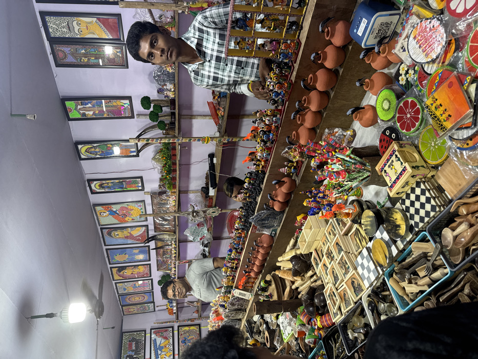 The image depicts an indoor handicraft market stall located in Bidhannagar, India