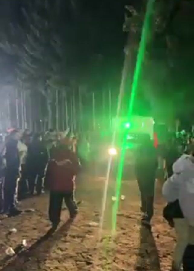 nighttime outdoor gathering of people in a wooded area. A white vehicle with headlights on is slowly moving through the crowd. A stage with bright lights is visible in the background. The crowd is a mix of people wearing various clothing, including a person in a red jacket and another in a white jacket. The ground is uneven, appearing to be dirt or mud. There are trees lining the sides of the scene. Music is playing loudly.