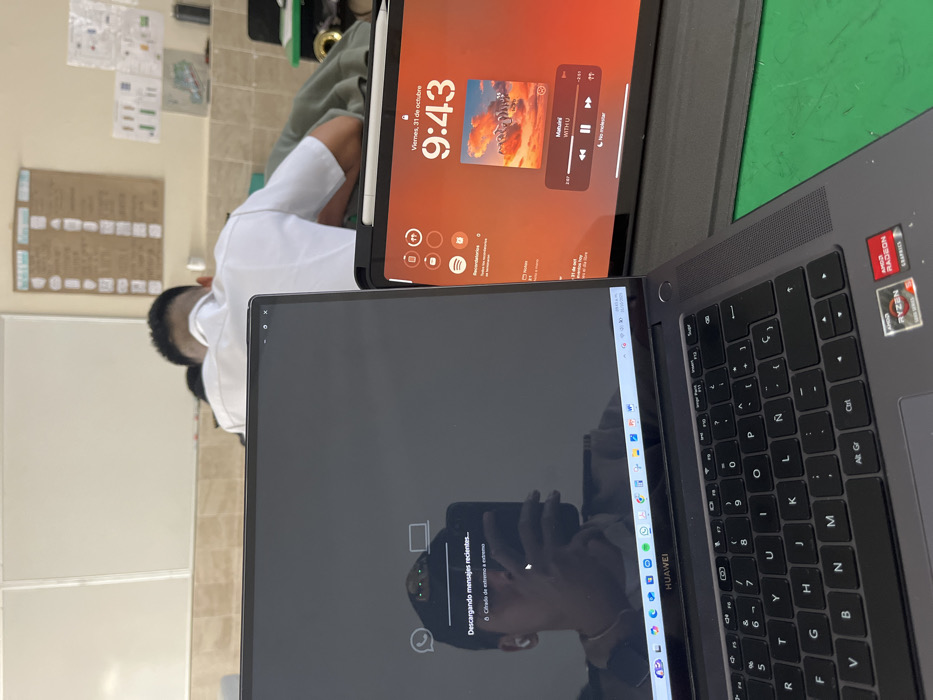 The image depicts a classroom scene, observed from the perspective of a student seated at a desk. In the immediate foreground, a dark gray Huawei laptop is open, displaying a dark-mode WhatsApp interface with text indicating "Descargando mensajes recientes..." (Downloading recent messages...) and "Cifrado de extremo a extremo" (End-to-end encrypted). The laptop screen reflects the person holding a phone to capture the image, revealing a young individual with short hair, wearing a striped shirt and white earbuds. To the right of the laptop, an iPad in a dark case with an attached Apple Pencil displays its lock screen. The iPad shows the time "9:43," the date "Viernes, 31 de octubre" (Friday, October 31), and a Spotify widget playing "Matuini - WITH U," along with "Recordatorios" (Reminders) and "Notas" (Notes) in Spanish. Both devices rest on a dark surface, partially covering a bright green surface beneath. In the midground, the back of another student is visible, wearing a white short-sleeved uniform shirt and possessing short, faded hair. This student is seated at a desk, leaning forward. The background consists of a classroom wall with a light-colored tiled lower section and a lighter upper section. Two blank whiteboards are mounted on the upper wall to the left. To the right, a brown board with a vertical list is present, and further right, additional items resembling diagrams or posters are affixed to the wall. The general environment is consistent with a school classroom. While the prompt requests the location in Veracruz City, Mexico, no specific identifying markers within the image confirm a precise location within that city.