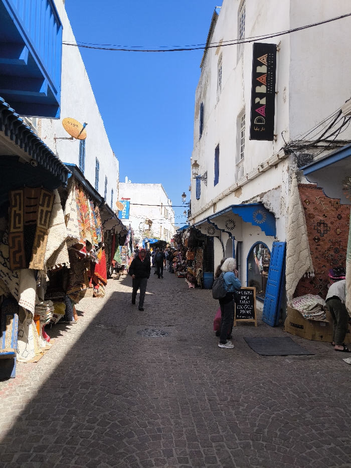 An outdoor image depicts a narrow cobblestone alleyway in Essaouira, Morocco, flanked by multi-story white buildings under a clear blue sky