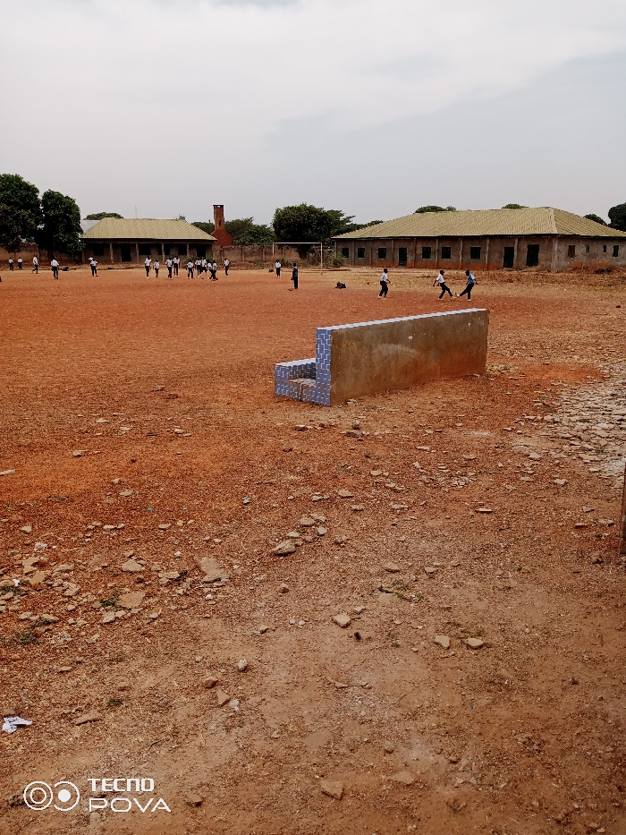 An outdoor scene in Kakuri Gwari, Nigeria, depicts a schoolyard or community field under an overcast sky