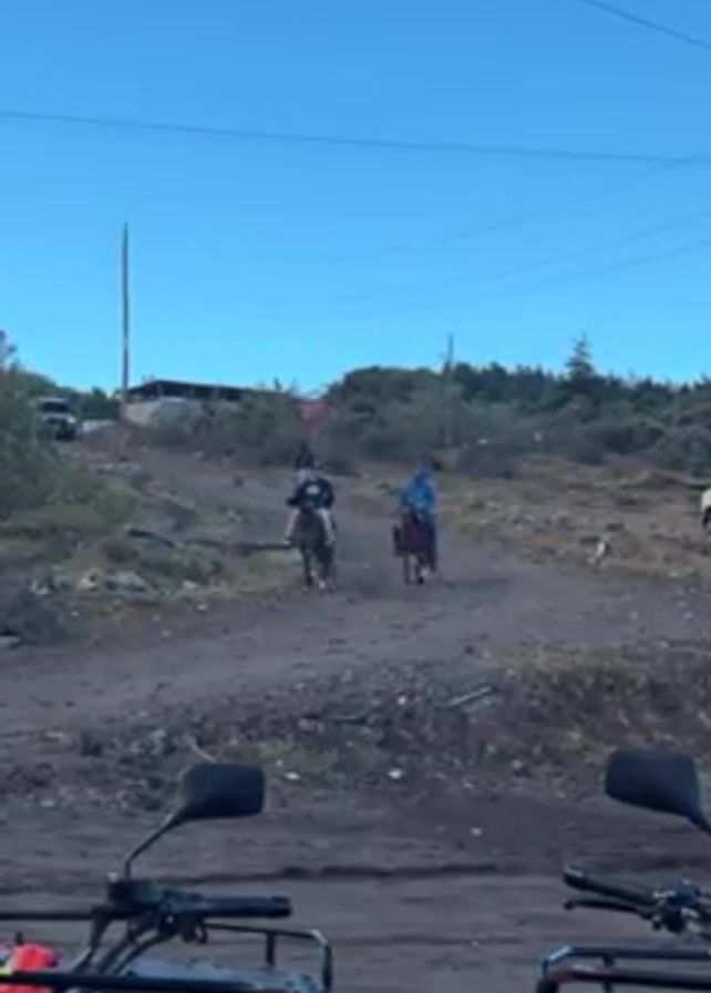 Two horses approach, each ridden by a person. The person on the left is wearing black, while the person on the right is wearing blue. They are coming down a dirt road on an incline. The road is rocky. In the foreground are the front parts of two red ATVs. Overhead are power lines, and in the distance, a building is visible on top of the hill. The sky is clear and blue.