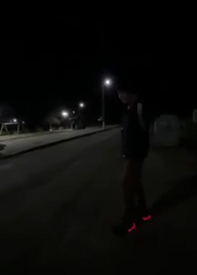 A person stands on an asphalt road at night, lit by distant streetlights. The person is wearing a dark jacket, dark pants, and shoes that have red lights on the heel. The person moves their arms in a circular motion, possibly mimicking a dance or gesture, and then continues standing. The environment appears to be an outdoor park or area with benches and trees visible in the background under the streetlights. The overall scene is dark, with the red lights on the person's shoes providing a point of contrast.