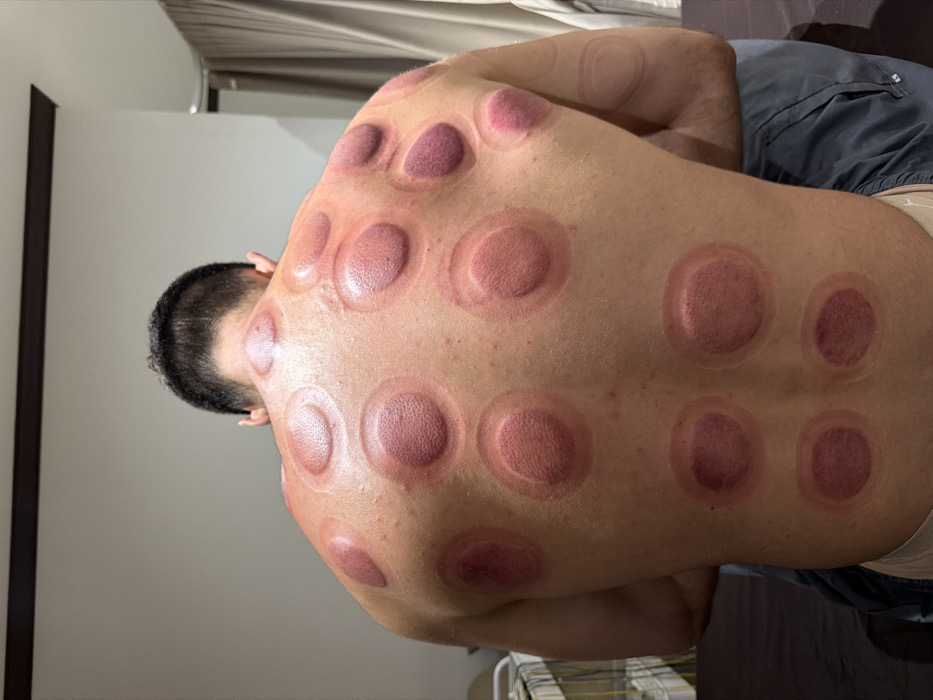 The image displays the bare back of an adult male, seated and facing away from the viewer, exhibiting numerous circular areas of ecchymosis and erythema consistent with a recent cupping therapy session