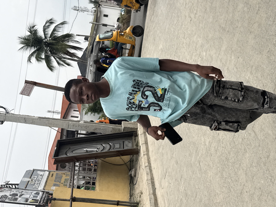 The image presents an urban street scene in Ado, Nigeria, under an overcast sky. In the foreground, a young male with short dark hair stands or walks on a light grey paved surface. He wears a light blue t-shirt displaying "PENSALDO 52" and other graphics, along with grey, acid-wash cargo pants. His left hand holds a black smartphone, partially tucked into his waistband. To the subject's left, a yellow building features signage indicating "DP SECURITY SOLUTION" and "LOGISTICS SERVICE." A dark, ornate metal door stands vertically, leaning near the building's entrance. A concrete utility pole rises from the left side of the street. To the right of the subject, a large palm tree is visible, along with a white building in the mid-ground. At least two yellow motorized tricycles, commonly known as keke Napep, are present; one is in motion or parked with multiple occupants. Utility lines traverse the upper portion of the frame.
