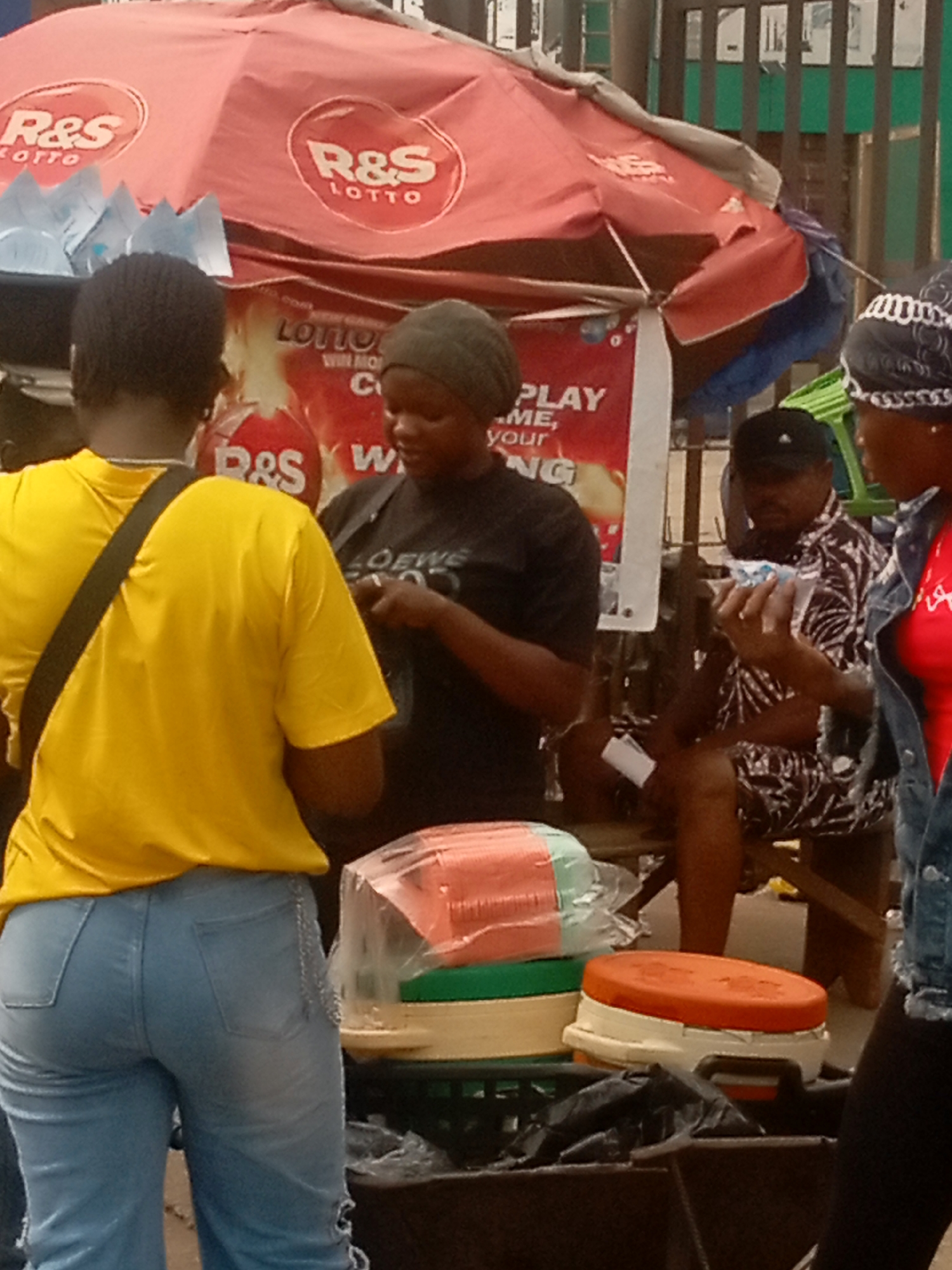 street scene in Onitsha, Nigeria. Underneath a red umbrella bearing "R&S LOTTO" branding, a woman in a black shirt and gray cap appears to be using a mobile phone, possibly interacting with customers for a lottery transaction. Behind her, a banner echoes the "R&S LOTTO" logo. To the left of the lottery vendor, a person wearing a yellow shirt and blue jeans stands with their back to the camera. Another person in a black baseball cap and patterned shirt sits on a stool in the background, holding what looks like lottery tickets. To the right, a person is wearing a denim jacket and red shirt. In the foreground, on what appears to be a cart or table, are stacks of what may be food containers, wrapped in clear plastic. The immediate environment suggests an active urban setting, indicative of a bustling commercial center like Onitsha.