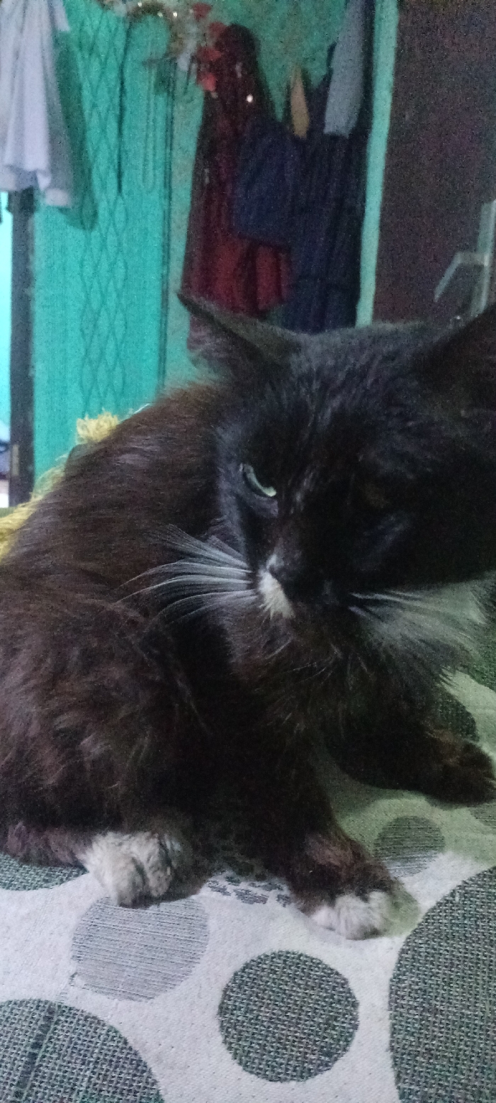 - "A dark-furred cat, predominantly black or very dark brown, is depicted resting indoors in Cipinang, Indonesia" by FM-mGKU03, licensed under CC BY 4.0