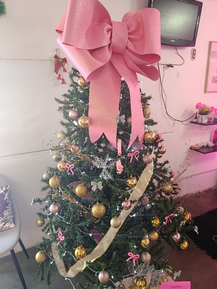 This image captures an indoor festive scene, likely a commercial establishment or residence, located in Altagracia, Venezuela. The central subject is a heavily decorated artificial Christmas tree adorned primarily in a pink and gold color scheme. The tree features a large, glittery pink bow as its prominent topper. Numerous spherical ornaments in gold, rose gold, and pink, some with glitter, are distributed throughout the branches. Smaller pink and silver bows, white string lights, and a wide, glittery gold ribbon are interwoven into the foliage. Additional decorations include snowflake ornaments, small pink figures resembling Santa Claus or angels, and naturalistic branches with berries. To the left of the tree, a portion of a white chair with a black frame and a purple sequined cushion is visible. The background consists of light-colored walls. On the upper right wall, a black, non-operational television screen is mounted, with visible wires beneath it. Below the television, two black floating shelves are affixed: the top shelf displays small potted plants with pink flowers, and the bottom shelf holds white cups or mugs. A red Christmas bow with small bells hangs on the upper left wall section. Ambient pink lighting illuminates the area near the shelves. The floor visible includes a dark-colored rug on the right and a lighter, possibly tiled or concrete, surface elsewhere. No individuals are present in the scene.